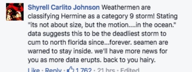 13. "Weathermen are classifying Hermine as a category 9 storm! Stating "it's not about size, but the motion ... in the ocean." Data suggests this to be the deadliest storm to cum to North Florida since ... forever. Seamen are warned to stay inside. We'll have more news for you as more data erupts. Back to you Hairy."