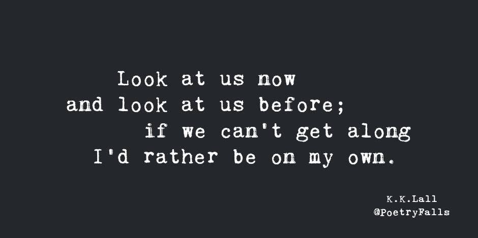 "Look at us now and look at us before; if we can't get along I'd rather be on my own." — @PoetryFalls