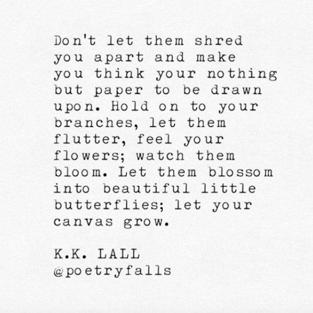 "Don't let them shred you apart and make you think you're nothing but paper to be drawn upon. Hold onto your branches, let them flutter, feel your flowers; watch them bloom. Let them blossom into a beautiful little butterflies; let your canvas grow." — @PoetryFalls