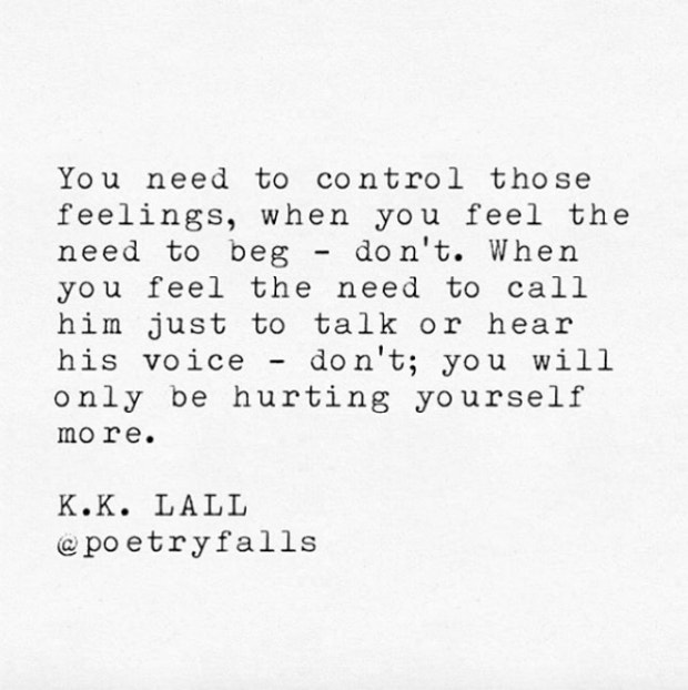 "You need to control those feelings, when you feel the need to beg - don't. When you feel the need to call him just to talk or hear his voice - don't; you will only be hurting yourself more." — @PoetryFalls