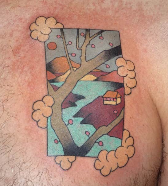 At first glance, everything about this tattoo says "traditional Japanese woodblock print." There's a traditional Japanese room, and you can peek out onto a beautiful courtyard. But look a little closer and you'll see the fun modern (and tasty) twist: a slushie drink and a pink donut!