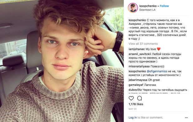 If the angular face, blond hair and blue eyes, and last name didn’t give it away, his Russian Instagram captions will! However, it looks like he now calls the United States his home. “From the moment I was in America, I erased such concepts as "winter, spring, summer, autumn" because the weather is good all year round,” he wrote in a recent Instagram post. “In LA, according to statistics, 320 days of sunshine a year.” Thanks, Google translate!