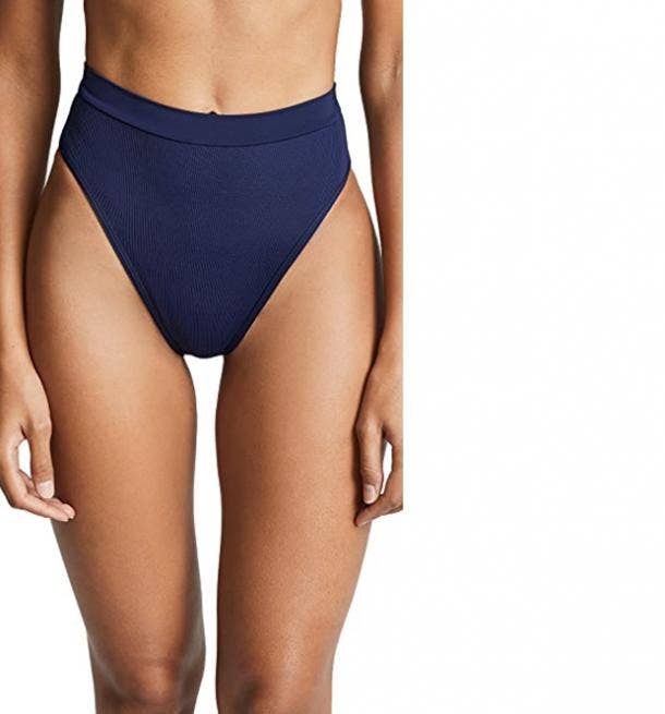 These cheeky high-waisted bikini bottoms come in midnight blue, but are far from cliché. The bottoms have a ribbed fabric, the inside is lined, and the style itself is pretty fashion-forward.