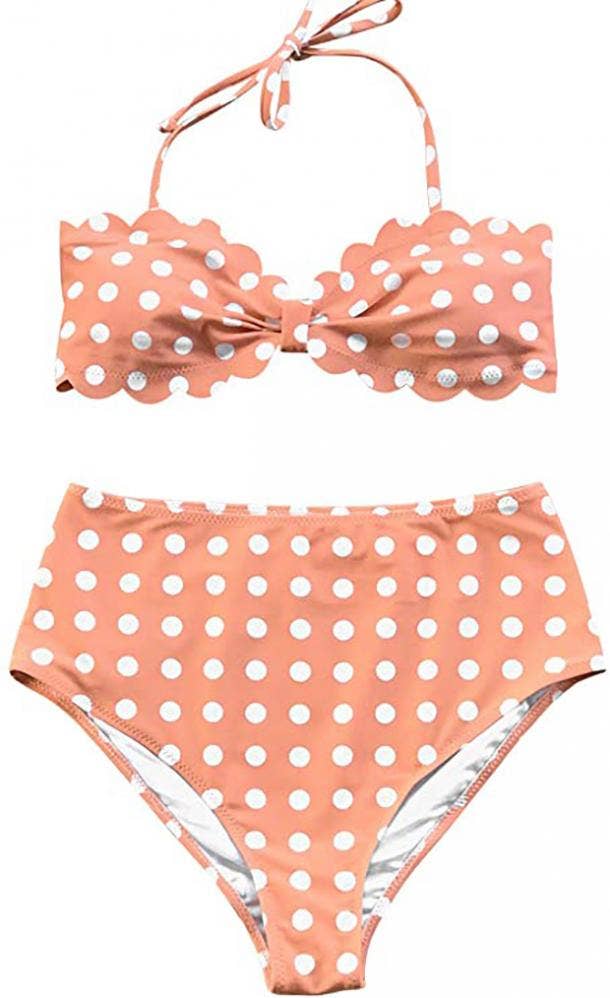 How cute is this swimsuit? The retro two-piece bikini is vintage-inspired, and has an adjustable halter top with clasp hook closures, so it provides plenty of support. Plus, the high-waisted bottoms are figure-flattering due to its pleated front panel.