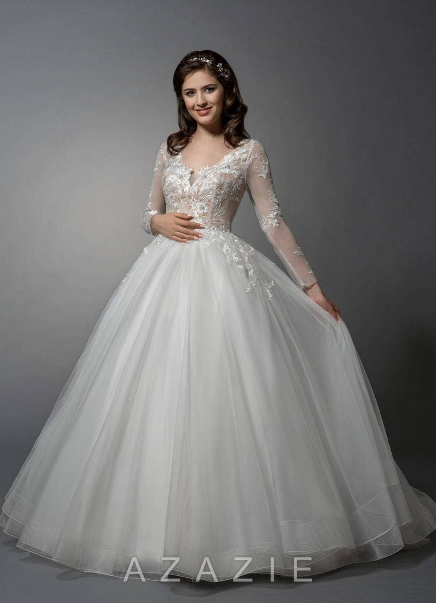 Freya is a lovely A-line gown with a sheer V-neck top featuring long sleeves and lace appliques. This whimsical dress has a full tulle skirt with the lace fading down from the top. The long sleeves create a classy look.