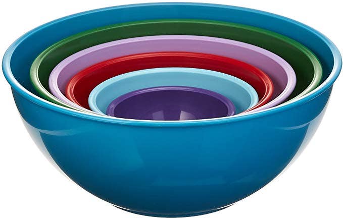 Whether you need a large bowl for mixing ingredients or a small one for dip, this 6-piece mixing bowl set is a must-have for your kitchen. Made of durable heavy-weight plastic, which makes them dishwasher, microwave, and freezer-safe, anyone who loves cooking and baking will find an instant use for these food prep bowls. Bonus: You can also use also use them as serving bowls and make a funky, colorful statement, because who doesn't love an item that has multiple uses?