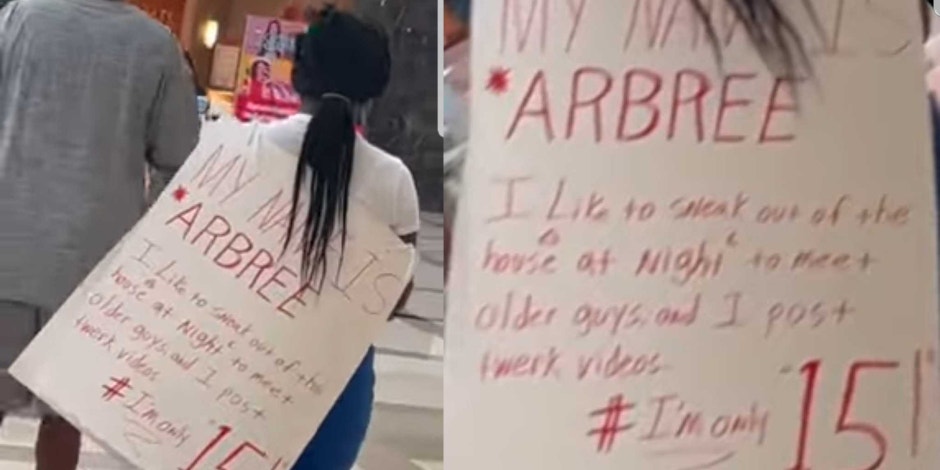 The video depicts the young girl wearing a large white sign that reads, "My name is Arbree. I like to sneak out of the house at night to meet older guys, and I post twerk videos. #I'm only 15!"