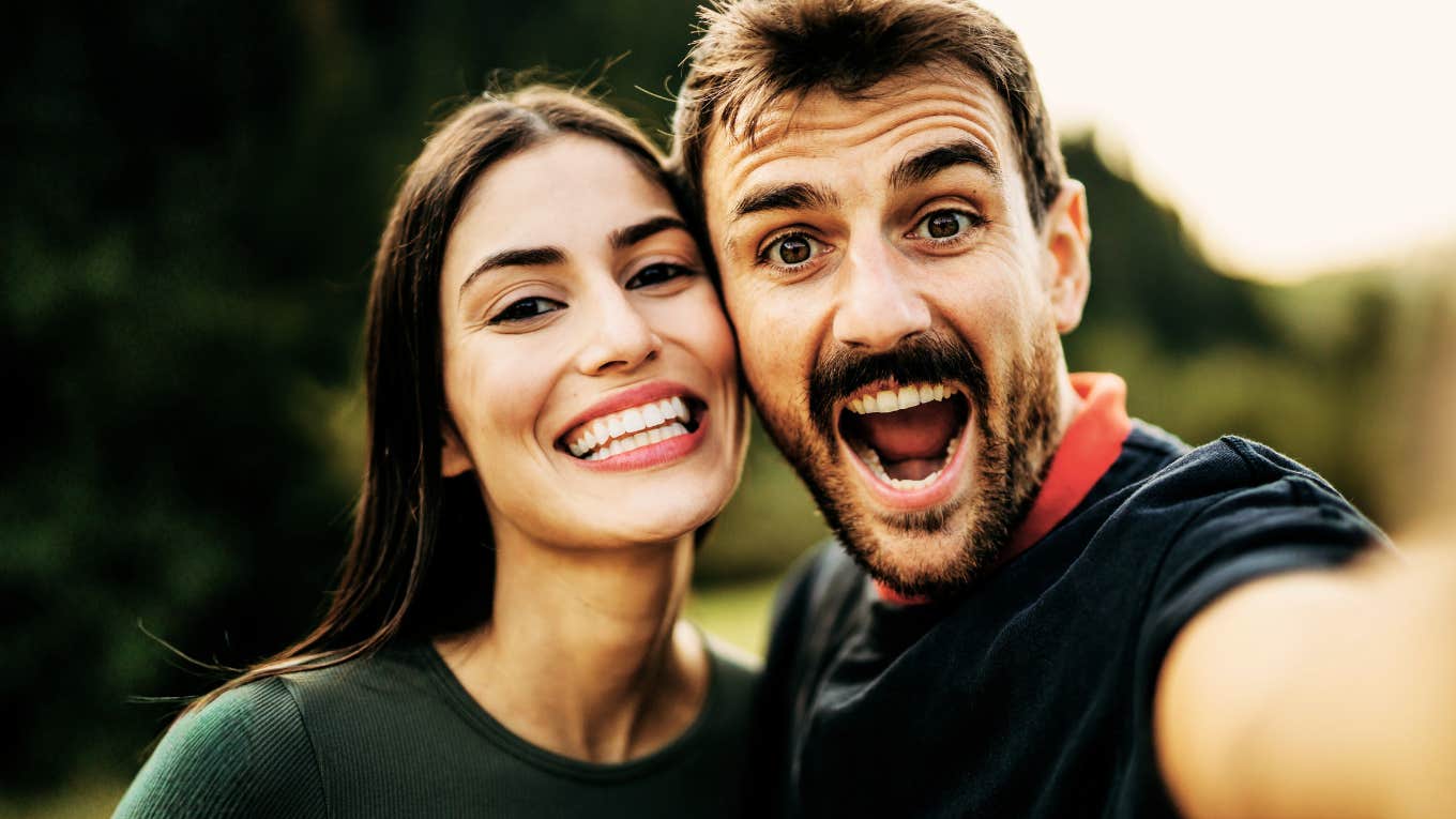 smiling couple taking close-up outdoor selfie in warm natural light, joyful authentic expressions, man with open-mouthed laugh and woman leaning in with bright smile. La Famiglia | Shutterstock