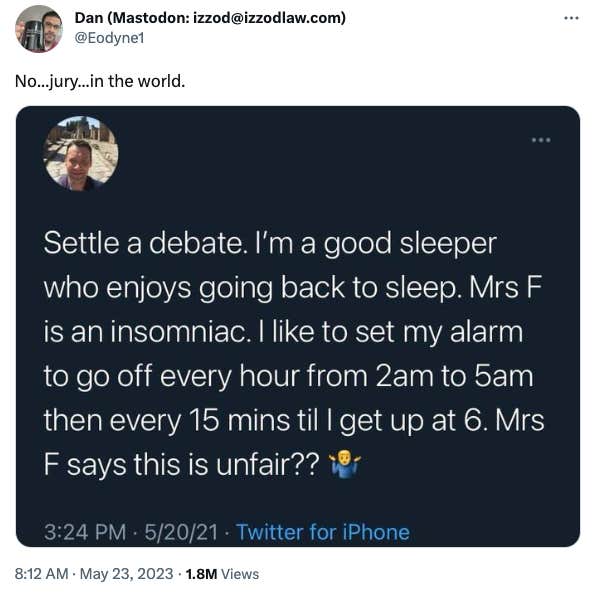 Prostock-studio | Shutterstock A man asked X to "settle a debate" between him and his wife, but wound up revealing his unhinged sleeping pattern, which many agreed was grounds for divorce. The self-described “good sleeper” said that he enjoys the process of waking up and going back to sleep before finally getting up for his day. However, he shares his bed with his wife, whom he calls "Mrs. F" and describes as an “insomniac.” Needless to say, she doesn't exactly appreciate his penchant for the snooze button.