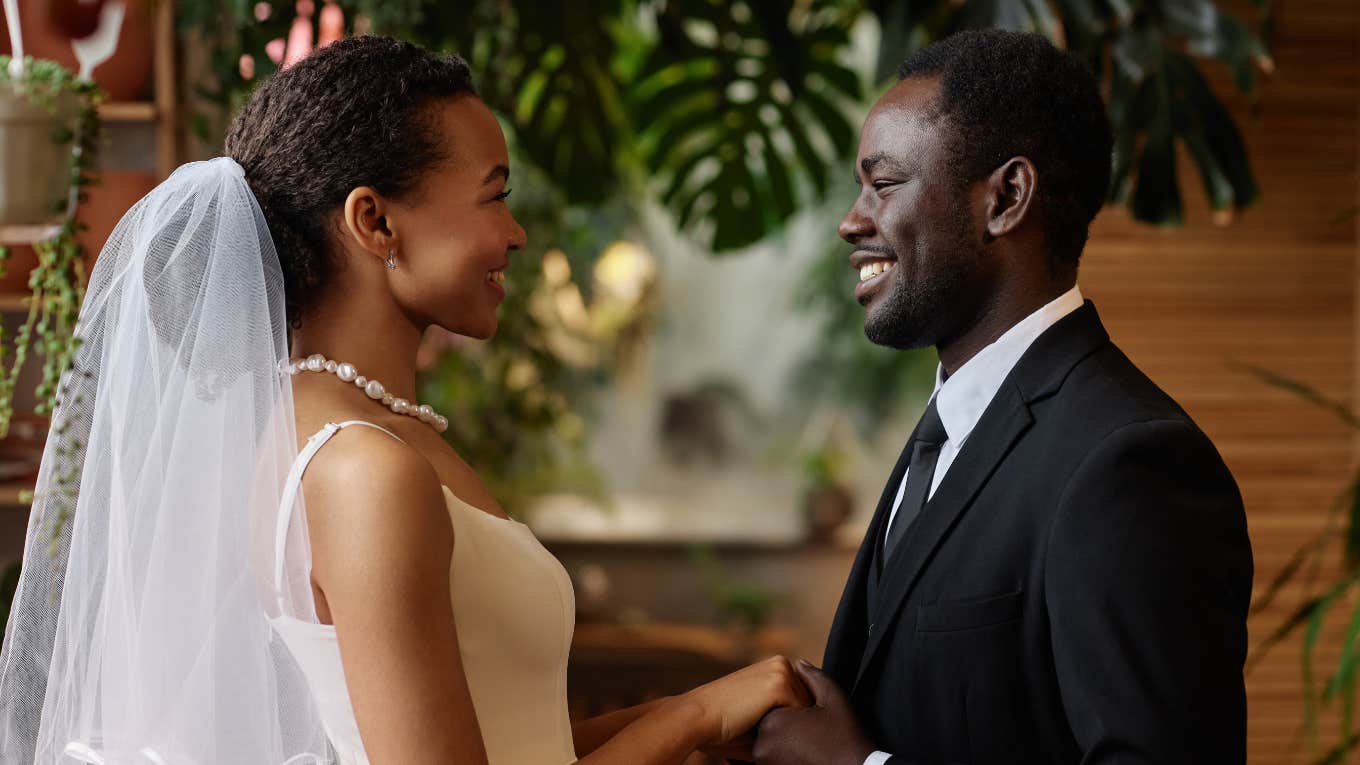 As the officiant recited the next line of the vows, "for poorer," the bride nodded her head but took an extra second to repeat it. The guests let out a few chuckles, including the groom, and while the bride smiled, it was clear she didn't quite believe it.