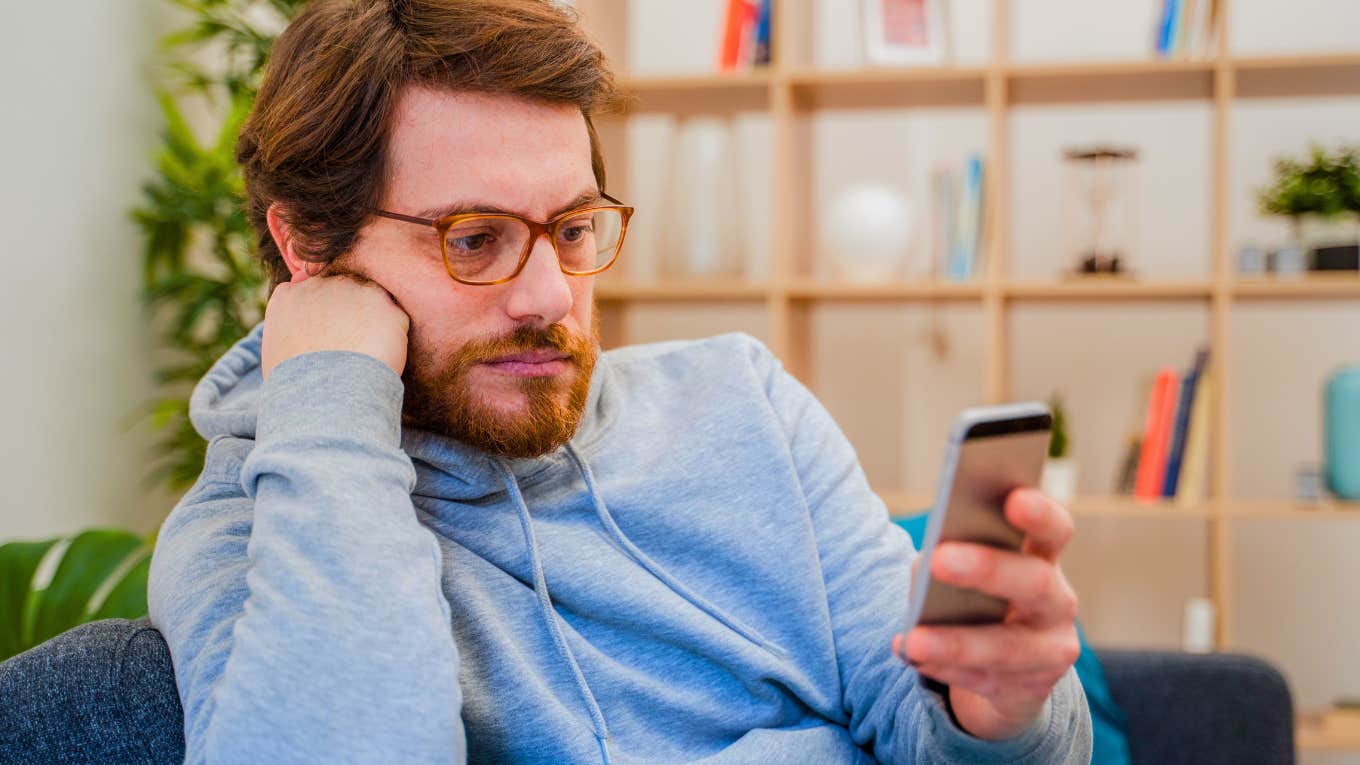 man who acts without thinking looking at his phone sitting next to his partner fizkes | Shutterstock