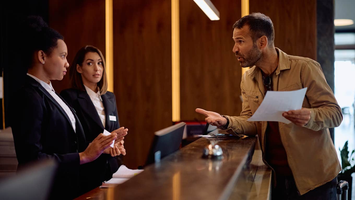 guest arguing with hotel workers behind desk Drazen Zigic | Shutterstock